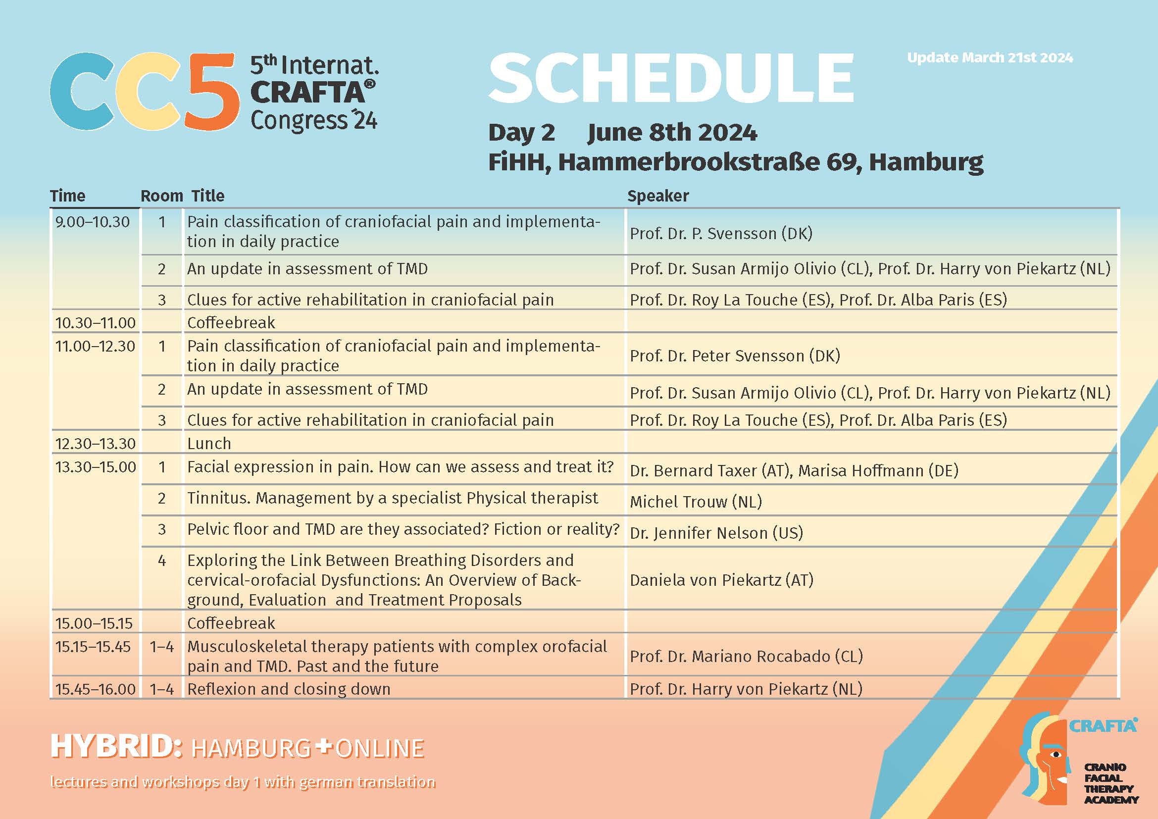 This workshop will contain an introduction to the classification systems of tinnitus and the possible position of a specialist Physical therapist. Then we will discuss the CRAFTA examination